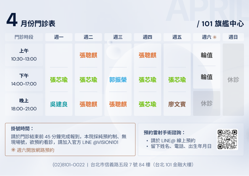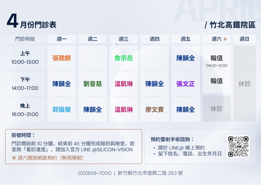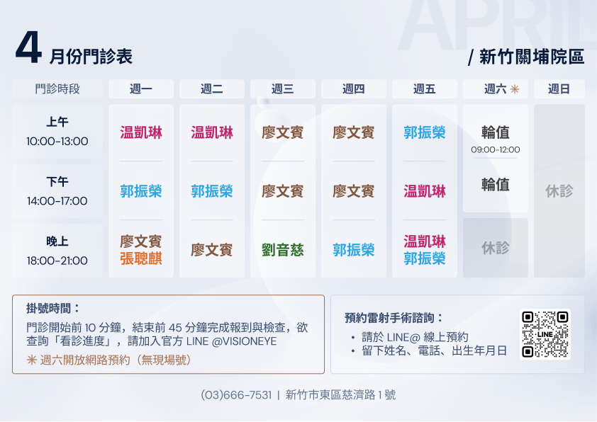 ※ 掛號時間 : 門診開始前10分鐘,門診結束前45分鐘完成報到、檢查