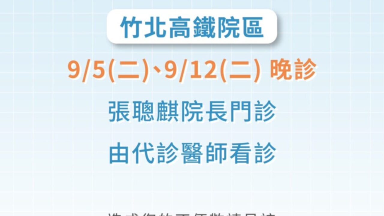 竹北高鐵院區9/5(二)、9/12(二)晚診 【張聰麒醫師門診】由其他醫師代診 造成您的不便敬請見諒