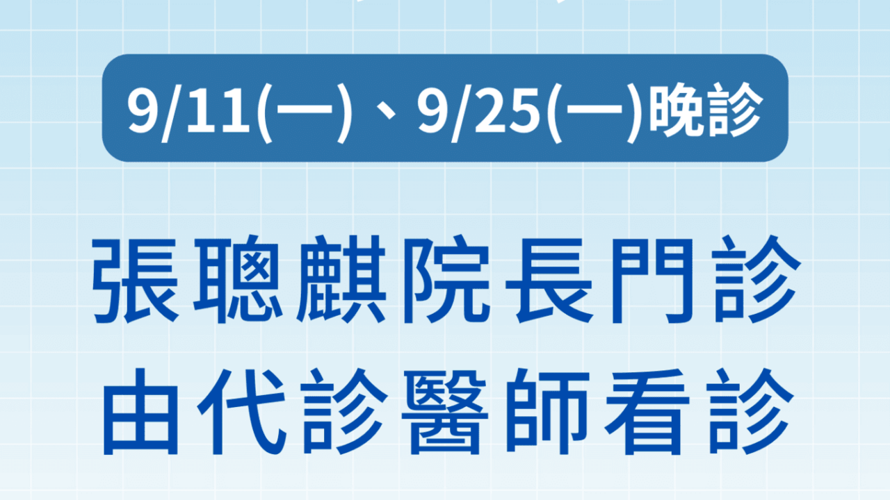 9/11(一)、9/25(一)晚診 【張聰麒醫師門診】由其他醫師代診 造成您的不便敬請見諒