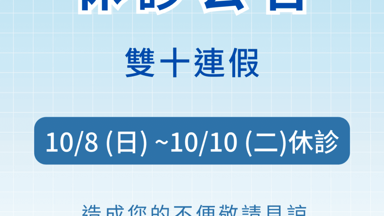 10/8(日)~10/10(二)休診 如需預約諮詢或有任何問題 歡迎於LINE@留言,將於上班日依序...