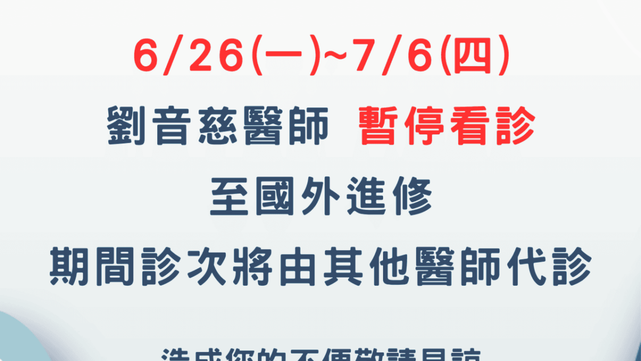 6/26(一)~7/6(四) 劉音慈醫師 暫停看診 至國外進修 期間診次將由其他醫師代診