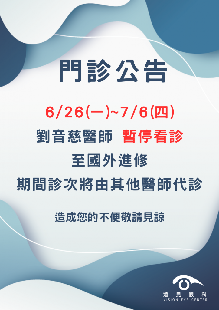 劉音慈醫師6月門診調整公告 2023 年 6 月 20 日 /Posted byvisioneye.cindy@gmail.com / 06/26(一)~7/6(四)劉音慈醫師,至國外進修【暫停看診】期間診次將由其他醫師代診造成您的不便敬請見諒 Share Post Twitter Facebook VK Pinterest Mail to friend Linkedin Whatsapp Skype SMILE Pro近視雷射術後隔天就騎車上班! 6月份連假休診公告 Related posts Read more 42歲年輕牙醫師!早發性白內障,術後重啟診間人生 2025 年 11 月 4 日 0 楊醫師執業多年,原本... Read more 看近模糊怎麼辦?眼睛「初老」報到!醫師教你自測老花度數、輕鬆找回清晰距離 2025 年 11 月 3 日 躺在床上滑手機越來越... Read more 鏡頭前的她更自在了,鏡頭後的生活也更清晰!三立新聞主播 曾鈴媛|SMILE Pro 2.0全飛秒近視雷射術後分享 2025 年 10 月 31 日 0 「對長年被近視困擾的... Read more 改變視界,從遠見開始!藝人 理想混蛋|SMILE Pro 2.0 全飛秒近視雷射 2025 年 10 月 30 日 0 離開近視的一路上,還... Read more 從模糊到清晰,姊妹一起重獲自由視界!Youtuber 李好哩賀|SMILE Pro 2.0 全飛秒近視雷射 2025 年 10 月 30 日 0 在 Instagra...