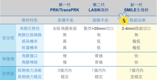 目前近視雷射手術方式主要為SMILE全飛秒、LASIK、PRK;手術方式的選擇應根據患者的眼睛情況、用眼習慣與需求等因素綜合考慮。建議患者諮詢資深的眼科醫師,進行詳細的術前檢查,由醫師根據患者的實際情況,建議最合適的手術方式。