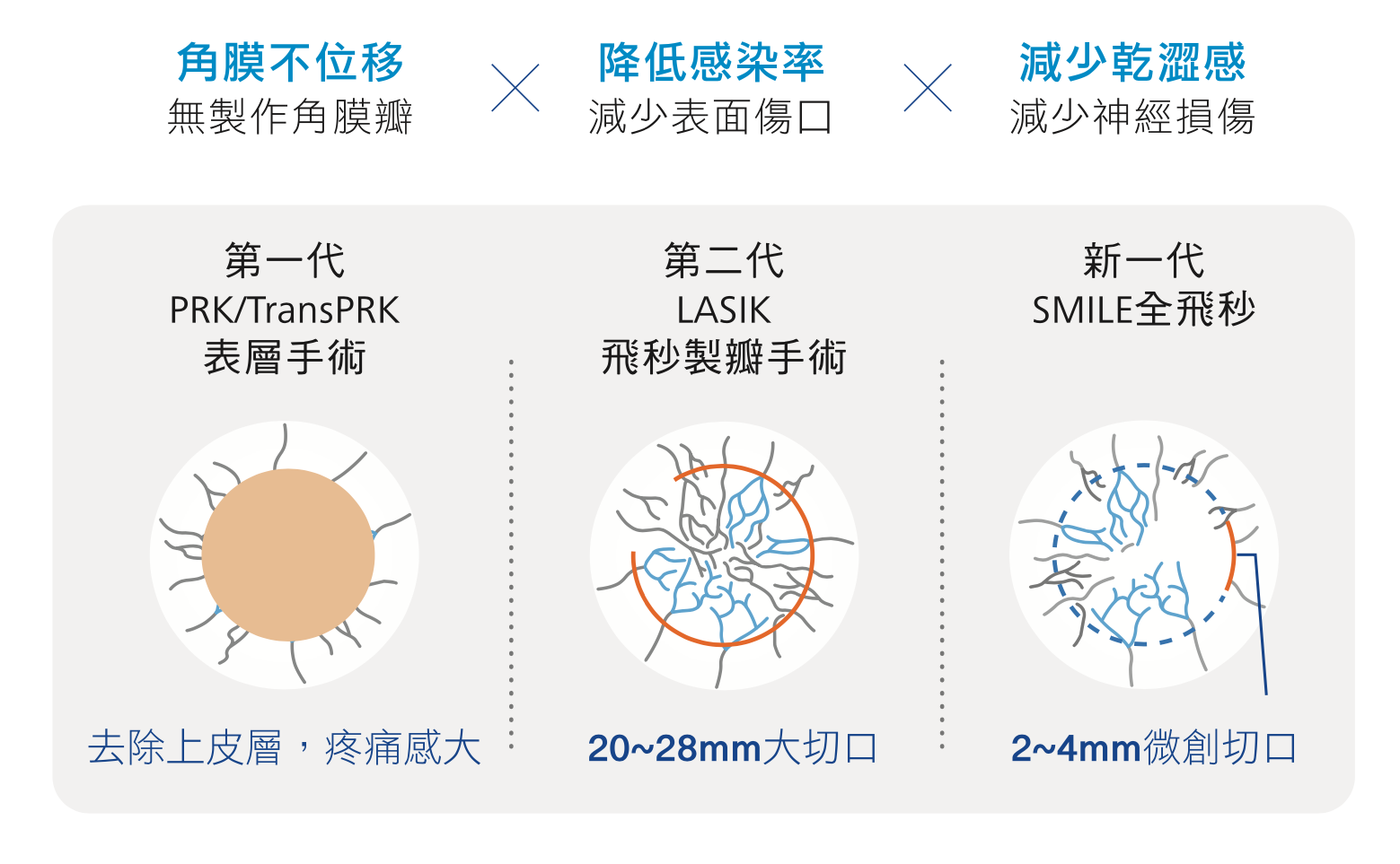 角膜表面只有筆尖大小的微創切口,縮短角膜修復期,安全性提升,更適合有運動習慣與不耐受隱形眼鏡族群。