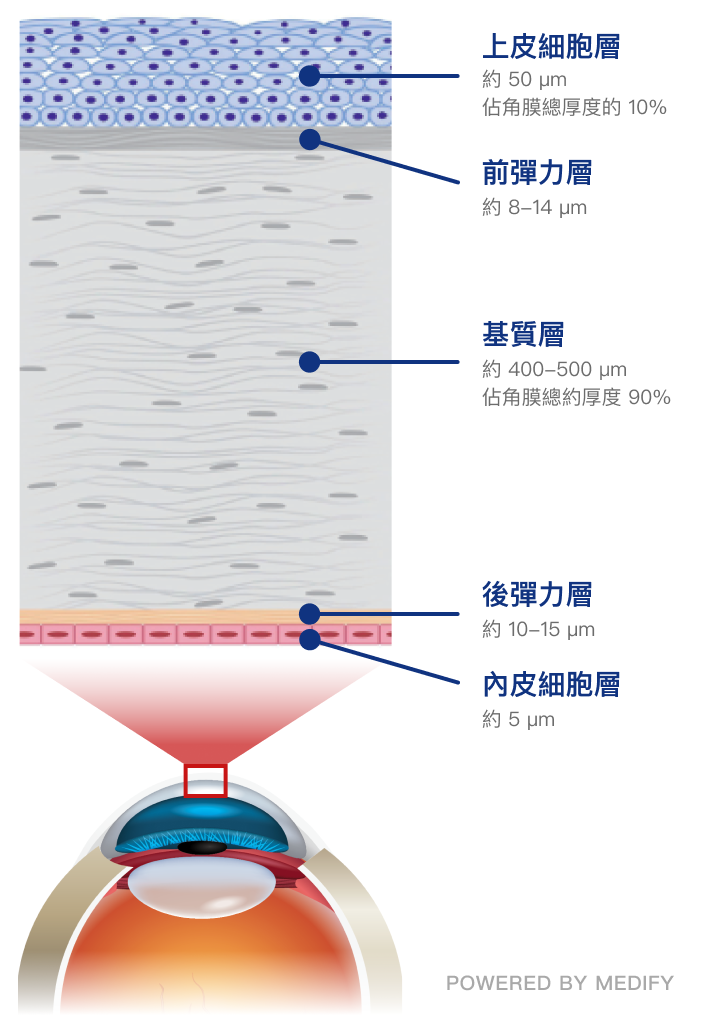 3. 基質層:透明不含血管,是角膜透明的重要因素。無法再生。因基質層具有一定厚度,可藉此特性矯正屈光穩定度數,並降低術後圓錐角膜發生。